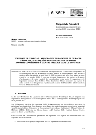 POLITIQUE DE L'HABITAT : APPROBATION DES STATUTS ET DU PACTE D'ASSOCIES DE LA SOCIÉTÉ DE COORDINATION DE FORMEANONYME COOPÉRATIVE À CAPITAL VARIABLE DANS LE HAUT-RHIN