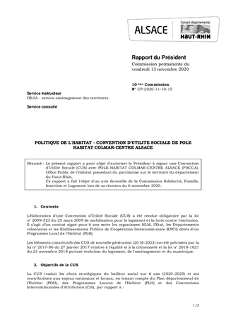 Le présent rapport a pour objet d'autoriser le Président à signer une Convention d'Utilité Sociale (CUS) avec POLE HABITAT COLMAR-CENTRE ALSACE (PHCCA), Office Public de l'Habitat possédant du patrimoine sur le territoire du département du Haut-Rhin. Ce rapport a fait l'objet d'un avis favorable de la Commission Solidarité, Famille, Insertion et Logement lors de sa réunion du 6 novembre 2020.