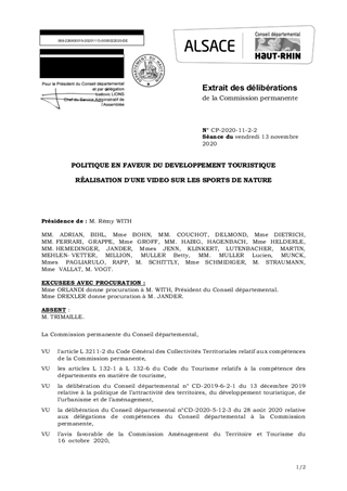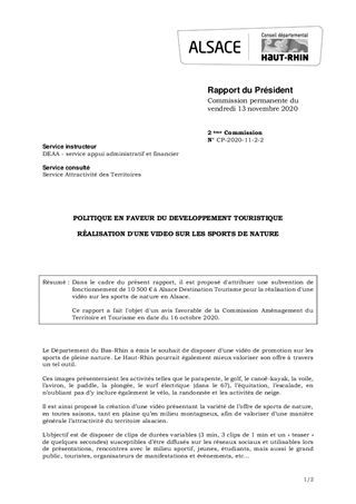 Dans le cadre du présent rapport, il est proposé d'attribuer une subvention de fonctionnement de 10 500 € à Alsace Destination Tourisme pour la réalisation d'une vidéo sur les sports de nature en Alsace. Ce rapport a fait l'objet d'un avis favorable de la Commission Aménagement du Territoire et Tourisme en date du 16 octobre 2020.