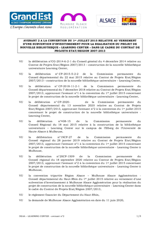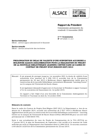 Il est proposé de proroger jusqu'au 1er novembre 2021 la durée de validité d'une subvention d'un montant de 2 896 545 € accordée lors de la Commission permanente du 22 mai 2015 à Mulhouse Alsace Agglomération (m2A) pour la construction de la nouvelle bibliothèque universitaire dénommée "Learning Center" sur le campus de l'Université de Haute-Alsace. Il est également demandé d'approuver et d'autoriser le Président à signer l'avenant n°2 à la convention de financement du 1er juillet 2015. Ce rapport a fait l'objet d'un avis favorable de la Commission Aménagement du Territoire et Tourisme en date du 16 octobre 2020.
