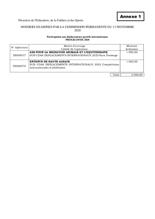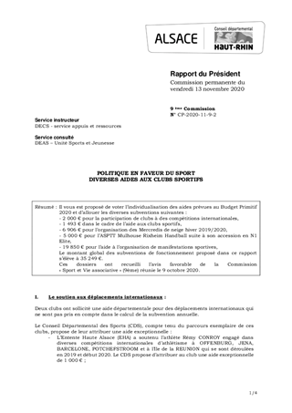 Il vous est proposé de voter l’individualisation des aides prévues au Budget Primitif 2020 et d’allouer les diverses subventions suivantes : - 2 000 € pour la participation de clubs à des compétitions internationales, - 1 493 € dans le cadre de l’aide aux clubs sportifs, - 6 906 € pour l’organisation des Mercredis de neige hiver 2019/2020, - 5 000 € pour l’ASPTT Mulhouse Rixheim Handball suite à son accession en N1 Elite, - 19 850 € pour l’aide à l’organisation de manifestations sportives, Le montant global des subventions de fonctionnement proposé dans ce rapport s’élève à 35 249 €. Ces dossiers ont recueilli l’avis favorable de la Commission « Sport et Vie associative » (9ème) réunie le 9 octobre 2020.