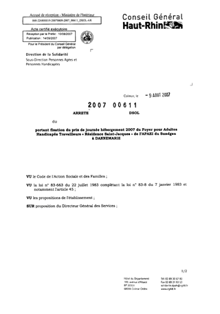 portant fixation du prix de journée hébergement 2007 du foyer pour adultes handicapés travailleurs "Résidence Saint-Jacques" de l'APAEI du Sundgau à DANNEMARIE. Resumé Pièces jointes ARRETE Assemblée : Non défini Date : 09/08/2007 Rapporteur : Non défini Collectivité : Conseil départemental du Haut-Rhin Direction : Non défini Service : Direction Adjointe Personnes Agées et Personnes Handicapées Domaine : Prix de Journée Commission :