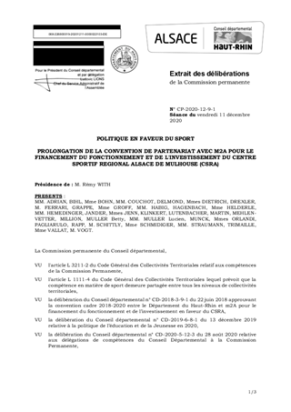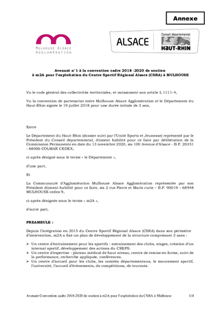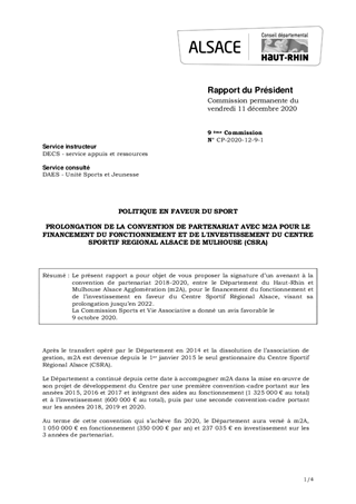 Le présent rapport a pour objet de vous proposer la signature d’un avenant à la convention de partenariat 2018-2020, entre le Département du Haut-Rhin et Mulhouse Alsace Agglomération (m2A), pour le financement du fonctionnement et de l’investissement en faveur du Centre Sportif Régional Alsace, visant sa prolongation jusqu’en 2022. La Commission Sports et Vie Associative a donné un avis favorable le 9 octobre 2020.