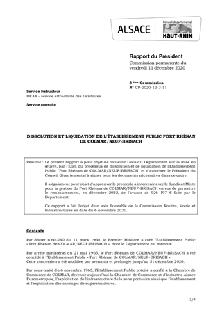 Le présent rapport a pour objet de recueillir l'avis du Département sur la mise en œuvre, par l'Etat, du processus de dissolution et de liquidation de l'Etablissement Public "Port Rhénan de COLMAR/NEUF-BRISACH" et d'autoriser le Président du Conseil départemental à signer tous les documents nécessaires dans ce cadre. Il a également pour objet d'approuver le protocole à intervenir avec le Syndicat Mixte pour la gestion du Port Rhénan de COLMAR/NEUF-BRISACH en vue de permettre le remboursement, en décembre 2022, de l'avance de 926 197 € faite par le Département. Ce rapport a fait l'objet d'un avis favorable de la Commission Routes, Voirie et Infrastructures en date du 6 novembre 2020.