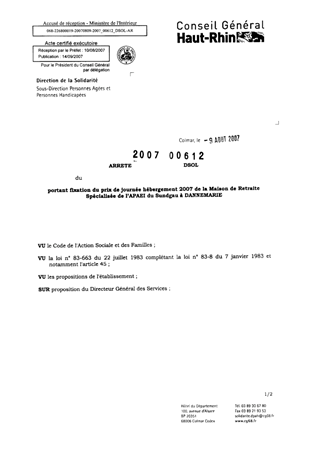 portant fixation du prix de journée hébergement 2007 de la maison de retraite spécialisée de l'APAEI du Sundgau à DANNEMARIE. Resumé Pièces jointes ARRETE Assemblée : Non défini Date : 09/08/2007 Rapporteur : Non défini Collectivité : Conseil départemental du Haut-Rhin Direction : Non défini Service : Direction Adjointe Personnes Agées et Personnes Handicapées Domaine : Prix de Journée Commission :