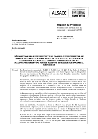 DÉSIGNATION DES REPRÉSENTANTS DU CONSEIL DÉPARTEMENTAL AU CONSEIL DE FAMILLE N°2 DES PUPILLES DE L'ETAT DU HAUT-RHIN ET CONVENTION RELATIVE AU DISPOSITIF D'HEBERGEMENT ET D'ACCOMPAGNEMENT DE JEUNES MAJEURS EN RESIDENCE SOCIALE A RIEDISHEIM