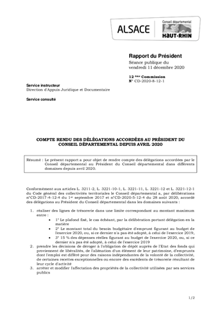 Le présent rapport a pour objet de rendre compte des délégations accordées par le Conseil départemental au Président du Conseil départemental dans différents domaines depuis avril 2020.