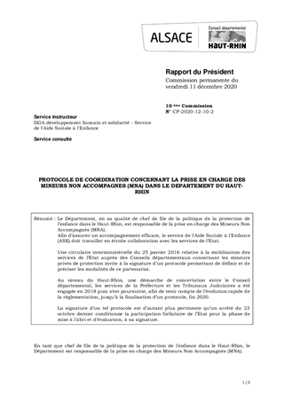 Le Département, en sa qualité de chef de file de la politique de la protection de l’enfance dans le Haut-Rhin, est responsable de la prise en charge des Mineurs Non Accompagnés (MNA). Afin d’assurer un accompagnement efficace, le service de l’Aide Sociale à l'Enfance (ASE) doit travailler en étroite collaboration avec les services de l’Etat. Une circulaire interministérielle du 25 janvier 2016 relative à la mobilisation des services de l’Etat auprès des Conseils départementaux concernant les mineurs privés de protection invite à la signature d’un protocole permettant de définir et de préciser les modalités de ce partenariat. Au niveau du Haut-Rhin, une démarche de concertation entre le Conseil départemental, les services de la Préfecture et les Tribunaux Judiciaires a été engagée en 2018 puis s’est poursuivie, afin de tenir compte de l’évolution rapide de la réglementation, jusqu’à la finalisation d’un protocole, fin 2020. La signature d’un tel protocole est d’autant plus pertinente qu’un arrêté du 23 octobre dernier conditionne la participation forfaitaire de l’Etat pour la phase de mise à l’abri et d’évaluation, à sa signature.