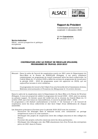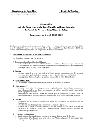 Dans le cadre de l’accord de coopération conclu en 2001 entre le Département du Haut-Rhin et le Powiat de WROCLAW (Pologne), il est prévu d’élaborer conjointement un programme de travail trisannuel entre les deux collectivités. Le Comité Mixte du 14 octobre 2020 a défini les actions du programme de travail pour la période 2020 - 2023 (le programme ayant été approuvé en 2020), qui est aujourd’hui soumis à votre validation. Ce programme de travail a fait l’objet d’un avis favorable de la Commission Actions, Relations internationales et Promotion du Bilinguisme le 16 octobre dernier.