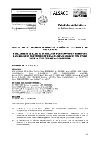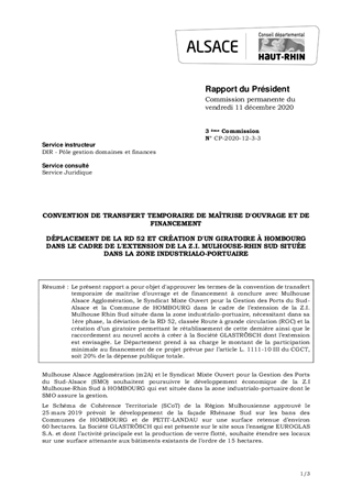 CONVENTION DE TRANSFERT TEMPORAIRE DE MAÎTRISE D'OUVRAGE ET DE FINANCEMENTDÉPLACEMENT DE LA RD 52 ET CRÉATION D'UN GIRATOIRE À HOMBOURG DANS LE CADRE DE L'EXTENSION DE LA Z.I. MULHOUSE-RHIN SUD SITUÉE DANS LA ZONE INDUSTRIALO-PORTUAIRE