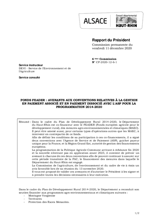 Dans le cadre du Plan de Développement Rural 2014-2020, le Département du Haut-Rhin est co-financeur avec le FEADER (Fonds européen agricole pour le développement rural), des mesures agroenvironnementales et climatiques (MAEC). Il peut être amené aussi, pour certains types d’opérations autres que les MAEC, à intervenir en contrepartie de ce fonds. Afin de définir les conditions de sa participation à ces co-financements, il a signé deux conventions avec l’Agence de Service et de Paiement (ASP), guichet payeur unique pour la France, et la Région Grand Est, autorité de gestion des financements européens. La programmation de la Politique Agricole Commune arrivant à échéance fin 2020 et la nouvelle n’entrant pas en application avant 2023, il convient de prévoir un avenant à chacune de ces deux conventions afin de pouvoir continuer à assurer sur cette période transitoire de la PAC, le financement des mesures dans laquelle le Département du Haut-Rhin est engagé. La Commission de l'agriculture, de l'environnement et du cadre de vie à émis un avis favorable lors de sa réunion du 13 novembre 2020. Il vous est proposé de valider ces avenants et d’autoriser le Président à les signer et à prendre toutes les décisions nécessaires à leur exécution.