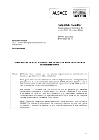 Différents sites occupés par les services départementaux connaissent des évolutions qui nécessitent d’être formalisées. Ainsi, pour les besoins du Service des Archives départementales, il est proposé de proroger pour 3 ans la convention d’occupation de 695,60 m² au bâtiment I de la cité administrative de COLMAR, moyennant un loyer annuel de 18 300 € par an et une participation aux frais de fonctionnement. Par ailleurs, à KINGERSHEIM, des locaux de 250 m² proposés par DOMIAL permettraient de reloger à la fois les agents du CMS de LUTTERBACH dont le bail a été résilié, et ceux du CMS de KINGERSHEIM qui pourraient reprendre les consultations de nourrissons. Le loyer demandé serait de 30 000 € par an, complété par des provisions sur charges de 600 € par an. Enfin, l’immeuble dans lequel les services sociaux départementaux interviennent à SIERENTZ a changé de propriétaire. La commune a accepté de poursuivre cette occupation et propose la signature d’une nouvelle convention à des conditions inchangées.