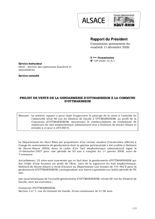 PROJET DE VENTE DE LA GENDARMERIE D'OTTMARSHEIM À LA COMMUNE D'OTTMARSHEIM