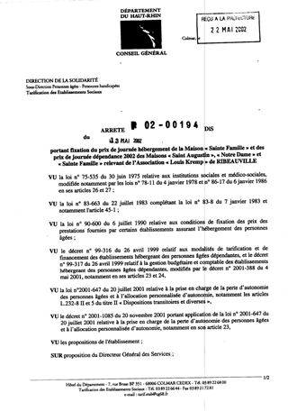 Portant fixation du prix de journée hébergement de la Maison Sainte Famille et des prix de journée dépendance 2002 des Maisons Saint Augustin, Notre dame et Sainte Famille relevant de l'Association Louis Kremp de RIBEAUVILLE Resumé Pièces jointes ARRETE Assemblée : Non défini Date : 13/05/2002 Rapporteur : Non défini Collectivité : Conseil départemental du Haut-Rhin Direction : Non défini Service : Service de la Tarification des Etablissements Domaine : Prix de Journée Commission :