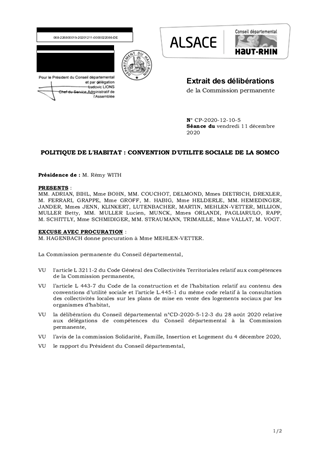 Le présent rapport a pour objet d’autoriser le Président à signer la Convention d’Utilité Sociale de la SOMCO pour la période 2020-2025 et de donner son avis sur son plan de mise en vente de 194 logements sociaux situés sur le territoire du Département du Haut-Rhin. La commission Solidarité, Famille, Insertion et Logement a exprimé un avis favorable en date du 4 décembre 2020.