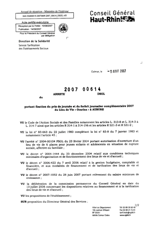 portant fixation du prix de journée et du forfait journalier complémentaire 2007 du lieu de vie "Ocarina" à AUBURE. Resumé Pièces jointes ARRETE Assemblée : Non défini Date : 09/08/2007 Rapporteur : Non défini Collectivité : Conseil départemental du Haut-Rhin Direction : Non défini Service : Service de la Tarification des Etablissements Domaine : Organisation Interne Commission :