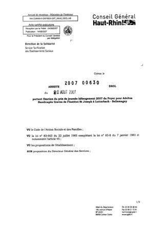 portant fixation du prix de journée hébergement 2007 du foyer pour adultes handicapés graves de l'Institut St Joseph à LUTTERBACH-BELLEMAGNY. Resumé Pièces jointes ARRETE Assemblée : Non défini Date : 20/08/2007 Rapporteur : Non défini Collectivité : Conseil départemental du Haut-Rhin Direction : Non défini Service : Service de la Tarification des Etablissements Domaine : Prix de Journée Commission :