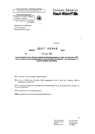 portant fixation de la dotation globale de fonctionnement au titre de l'exercice 2007 pour le service d'accompagnement à la vie sociale de l'Institut "Les Tournesols" à SAINTE MARIE AUX MINES. Resumé Pièces jointes ARRETE Assemblée : Non défini Date : 23/08/2007 Rapporteur : Non défini Collectivité : Conseil départemental du Haut-Rhin Direction : Non défini Service : Service de la Tarification des Etablissements Domaine : Dotations financières Commission :
