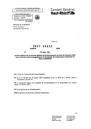 portant fixation de la dotation globale de fonctionnement au titre de l'exercice 2007 pour le service d'accompagnement à la vie sociale de l'Association Solidarité du Rhin à BIESHEIM. Resumé Pièces jointes ARRETE Assemblée : Non défini Date : 23/08/2007 Rapporteur : Non défini Collectivité : Conseil départemental du Haut-Rhin Direction : Non défini Service : Service de la Tarification des Etablissements Domaine : Dotations financières Commission :