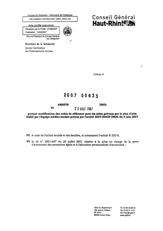 portant modification des coûts de référence pour les aides prévues par le plan d'aide établi par l'équipe médico-sociale prévus par l'arrêté 2007-00423-DSOL du 4 juin 2007. Resumé Pièces jointes ARRETE Assemblée : Non défini Date : 23/08/2007 Rapporteur : Non défini Collectivité : Conseil départemental du Haut-Rhin Direction : Non défini Service : Service de la Tarification des Etablissements Domaine : Autres (non classés) Commission :