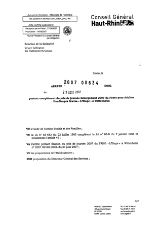 portant complément du prix de journée hébergement 2007 du foyer pour adultes handicapés graves "L'Etape" à WITTENHEIM. Resumé Pièces jointes ARRETE Assemblée : Non défini Date : 23/08/2007 Rapporteur : Non défini Collectivité : Conseil départemental du Haut-Rhin Direction : Non défini Service : Service de la Tarification des Etablissements Domaine : Prix de Journée Commission :