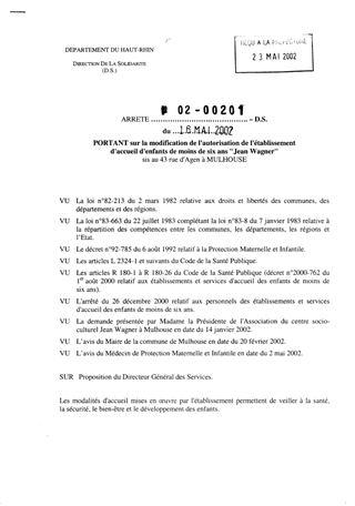 Portant sur la modification de l'autorisation de l'établissement d'accueil d'enfants de moins de six ans Jean Wagner Resumé Pièces jointes ARRETE Assemblée : Non défini Date : 16/05/2002 Rapporteur : Non défini Collectivité : Conseil départemental du Haut-Rhin Direction : Non défini Service : Service de Protection Maternelle et Infantile Domaine : Accueil d'enfants Commission :