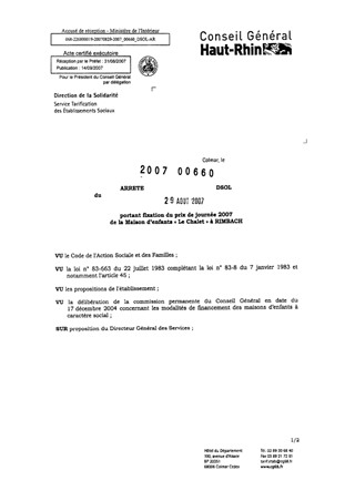 portant fixation du prix de journée 2007 de la maison d'enfants "Le Chalet" à RIMBACH. Resumé Pièces jointes ARRETE Assemblée : Non défini Date : 29/08/2007 Rapporteur : Non défini Collectivité : Conseil départemental du Haut-Rhin Direction : Non défini Service : Service de la Tarification des Etablissements Domaine : Prix de Journée Commission :