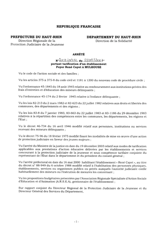 portant tarification d'un établissement foyer René Cayet à MULHOUSE. Resumé Pièces jointes ARRETE Assemblée : Non défini Date : 29/08/2007 Rapporteur : Non défini Collectivité : Conseil départemental du Haut-Rhin Direction : Non défini Service : Direction de la Solidarité Domaine : Prix de Journée Commission :