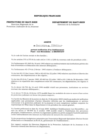 portant tarification d'un établissement foyer "Les Hirondelles" à BRUNSTATT. Resumé Pièces jointes ARRETE Assemblée : Non défini Date : 29/08/2007 Rapporteur : Non défini Collectivité : Conseil départemental du Haut-Rhin Direction : Non défini Service : Direction de la Solidarité Domaine : Prix de Journée Commission :