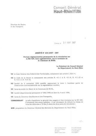 portant réglementation permanente de la circulation sur la RD 429, hors agglomération, sur le territoire de la commune de BUHL. Resumé Pièces jointes ARRETE Assemblée : Non défini Date : 31/08/2007 Rapporteur : Non défini Collectivité : Conseil départemental du Haut-Rhin Direction : Non défini Service : Direction des Routes Domaine : Circulation Commission :