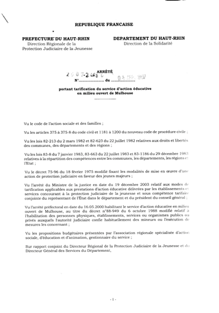 portant tarification du service d'action éducative en milieu ouvert de MULHOUSE. Resumé Pièces jointes ARRETE Assemblée : Non défini Date : 04/09/2007 Rapporteur : Non défini Collectivité : Conseil départemental du Haut-Rhin Direction : Non défini Service : Direction de la Solidarité Domaine : Prix de Journée Commission :