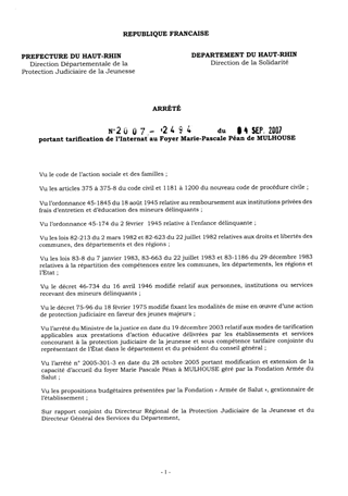 portant tarification de l'Internat au foyer Marie-Pascale Péan de MULHOUSE. Resumé Pièces jointes ARRETE Assemblée : Non défini Date : 04/09/2007 Rapporteur : Non défini Collectivité : Conseil départemental du Haut-Rhin Direction : Non défini Service : Direction de la Solidarité Domaine : Prix de Journée Commission :