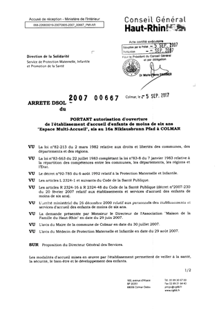 portant autorisation d'ouverture de l'établissement d'accueil d'enfants de moins de six ans "Espace Multi-Accueil", sis au 16a Niklausbrunn Pfad à COLMAR. Resumé Pièces jointes ARRETE Assemblée : Non défini Date : 05/09/2007 Rapporteur : Non défini Collectivité : Conseil départemental du Haut-Rhin Direction : Non défini Service : Service de Protection Maternelle et Infantile Domaine : Accueil d'enfants Commission :