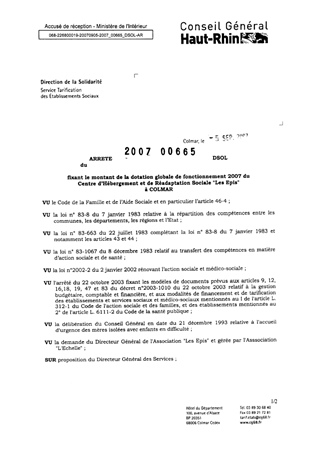 fixant le montant de la dotation globale de fonctionnement 2007 du centre d'hébergement et de réadaptation sociale "Les Epis" à COLMAR. Resumé Pièces jointes ARRETE Assemblée : Non défini Date : 05/09/2007 Rapporteur : Non défini Collectivité : Conseil départemental du Haut-Rhin Direction : Non défini Service : Service de la Tarification des Etablissements Domaine : Dotations financières Commission :
