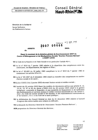 fixant le montant de la dotation globale de fonctionnement 2007 du centre d'hébergement et de réadaptation sociale "Soutien Femmes Battues" à SAINT LOUIS. Resumé Pièces jointes ARRETE Assemblée : Non défini Date : 05/09/2007 Rapporteur : Non défini Collectivité : Conseil départemental du Haut-Rhin Direction : Non défini Service : Service de la Tarification des Etablissements Domaine : Dotations financières Commission :