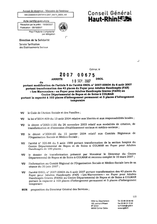 portant modification de l'article 9 de l'arrêté DSOL n° 2007-00604 du 6 août 2007 portant transformation des 43 places du foyer pour adultes handicapés (FAH) "Les Marronniers" en foyer pour adultes handicapés graves (FAHG) au centre dép. de repos à COLMAR