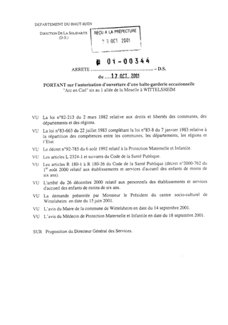 Portant sur l'autorisation d'ouverture d'une halte-garderie occasionnelle "Arc en ciel" Wittelsheim Resumé Pièces jointes ARRETE Assemblée : Non défini Date : 17/10/2001 Rapporteur : Non défini Collectivité : Conseil départemental du Haut-Rhin Direction : Non défini Service : Direction Adjointe Prévention / Insertion Domaine : Accueil d'enfants Commission :