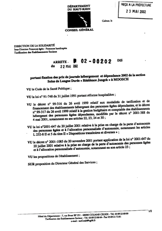 Portant fixation des prix de journée hébergement et dépendance 2002 de la section Soins de Longue Durée Résidence Jungck à MOOSCH Resumé Pièces jointes ARRETE Assemblée : Non défini Date : 22/05/2002 Rapporteur : Non défini Collectivité : Conseil départemental du Haut-Rhin Direction : Non défini Service : Service de la Tarification des Etablissements Domaine : Prix de Journée Commission :