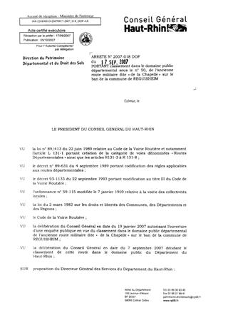 portant classement dans le domaine public départemental sous le n° 50, de l'ancienne route militaire dite "de la Chapelle" sur le ban de la commune de REGUISHEIM. Resumé Pièces jointes ARRETE Assemblée : Non défini Date : 17/09/2007 Rapporteur : Non défini Collectivité : Conseil départemental du Haut-Rhin Direction : Non défini Service : Service du Patrimoine et du droit des Sols Domaine : Déclassement de voirie Commission :