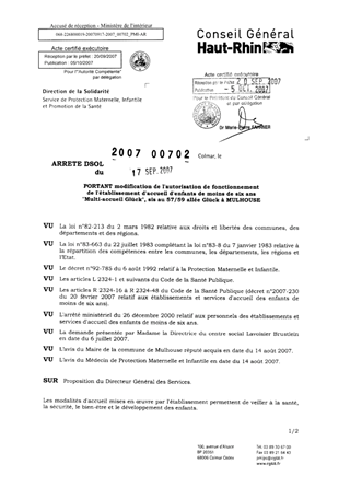 portant modification de l'autorisation de fonctionnement de l'établissement d'accueil d'enfants de moins de six ans "Multi-accueil Glück", sis au 57/59 allée Glück à MULHOUSE. Resumé Pièces jointes ARRETE Assemblée : Non défini Date : 17/09/2007 Rapporteur : Non défini Collectivité : Conseil départemental du Haut-Rhin Direction : Non défini Service : Service de Protection Maternelle et Infantile Domaine : Accueil d'enfants Commission :