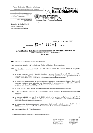 portant fixation de la dotation de fonctionnement 2007 de l'association de prévention spécialisée "Florimont" à COLMAR. Resumé Pièces jointes ARRETE Assemblée : Non défini Date : 17/09/2007 Rapporteur : Non défini Collectivité : Conseil départemental du Haut-Rhin Direction : Non défini Service : Service de la Tarification des Etablissements Domaine : Dotations financières Commission :