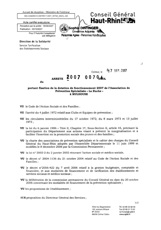 portant fixation de la dotation globale de fonctionnement 2007 de l'association de prévention spécialisée "La Ruche" à MULHOUSE. Resumé Pièces jointes ARRETE Assemblée : Non défini Date : 17/09/2007 Rapporteur : Non défini Collectivité : Conseil départemental du Haut-Rhin Direction : Non défini Service : Service de la Tarification des Etablissements Domaine : Dotations financières Commission :