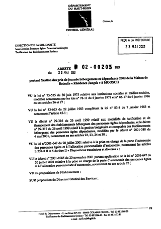 Portant fixation des prix de journée hébergement et dépendance 2002 de la Maison de Retraite Résidence Jungck à MOOSCH Resumé Pièces jointes ARRETE Assemblée : Non défini Date : 22/05/2002 Rapporteur : Non défini Collectivité : Conseil départemental du Haut-Rhin Direction : Non défini Service : Service de la Tarification des Etablissements Domaine : Prix de Journée Commission :