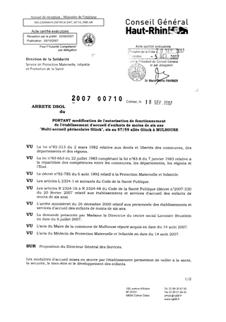 portant modification de l'autorisation de fonctionnement de l'établissement d'accueil d'enfants de moins de six ans "Multi-accueil périscolaire Glück", sis au 57/59 allée Glück à MULHOUSE. Resumé Pièces jointes ARRETE Assemblée : Non défini Date : 18/09/2007 Rapporteur : Non défini Collectivité : Conseil départemental du Haut-Rhin Direction : Non défini Service : Service de Protection Maternelle et Infantile Domaine : Accueil d'enfants Commission :