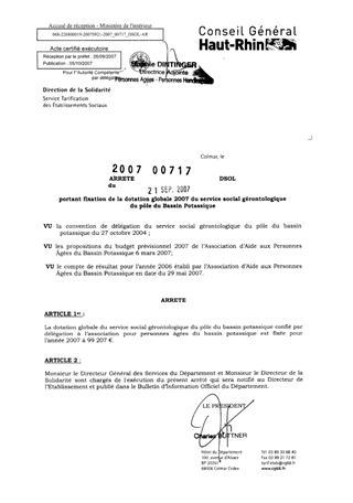 portant fixation de la dotation globale 2007 du service social gérontologique du pôle du Bassin Potassique. Resumé Pièces jointes ARRETE Assemblée : Non défini Date : 21/09/2007 Rapporteur : Non défini Collectivité : Conseil départemental du Haut-Rhin Direction : Non défini Service : Service de la Tarification des Etablissements Domaine : Dotations financières Commission :