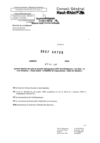 portant fixation du prix de journée hébergement 2007 des résidences "Les Pins" et "Les Cerisiers" "Saint André" à CERNAY de l'association "Adèle de Glaubitz". Resumé Pièces jointes ARRETE Assemblée : Non défini Date : 21/09/2007 Rapporteur : Non défini Collectivité : Conseil départemental du Haut-Rhin Direction : Non défini Service : Service de la Tarification des Etablissements Domaine : Prix de Journée Commission :