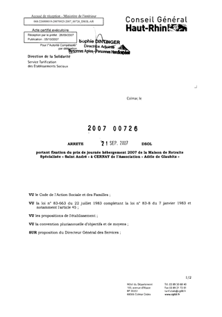 portant fixation du prix de journée hébergement 2007 de la maison de retraite spécialisée"Saint André" à CERNAY de l'association "Adèle de Glaubitz". Resumé Pièces jointes ARRETE Assemblée : Non défini Date : 21/09/2007 Rapporteur : Non défini Collectivité : Conseil départemental du Haut-Rhin Direction : Non défini Service : Service de la Tarification des Etablissements Domaine : Prix de Journée Commission :