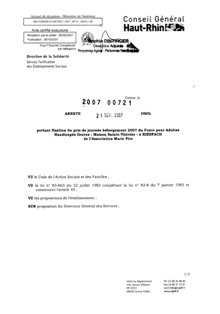 portant fixation du prix de journée hébergement 2007 du foyer pour adultes handicapés graves "Maison Sainte-Thérèse" à RIESPACH de l'Association Marie Pire. Resumé Pièces jointes ARRETE Assemblée : Non défini Date : 21/09/2007 Rapporteur : Non défini Collectivité : Conseil départemental du Haut-Rhin Direction : Non défini Service : Service de la Tarification des Etablissements Domaine : Prix de Journée Commission :