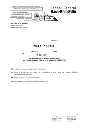 portant fixation du prix de journée 2007 du centre maternel ville de "L'Ermitage" à MULHOUSE. Resumé Pièces jointes ARRETE Assemblée : Non défini Date : 09/10/2007 Rapporteur : Non défini Collectivité : Conseil départemental du Haut-Rhin Direction : Non défini Service : Service de la Tarification des Etablissements Domaine : Prix de Journée Commission :