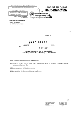 portant fixation du prix de journée 2007 de la pouponnière de "L'Ermitage" à MULHOUSE. Resumé Pièces jointes ARRETE Assemblée : Non défini Date : 09/10/2007 Rapporteur : Non défini Collectivité : Conseil départemental du Haut-Rhin Direction : Non défini Service : Service de la Tarification des Etablissements Domaine : Prix de Journée Commission :